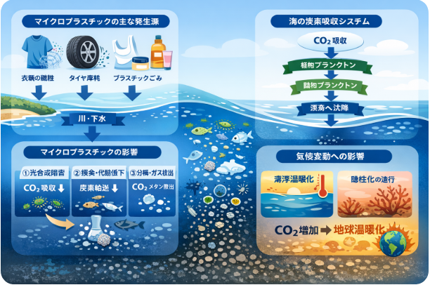 植物プランクトンは海洋のCO₂吸収の中心的存在です。しかし、マイクロプラスチックがプランクトンの表面に付着すると、光合成を妨げる可能性があります。また、プラスチックには有害化学物質が付着している場合があり、それがプランクトンの成長を抑制する可能性もあります。